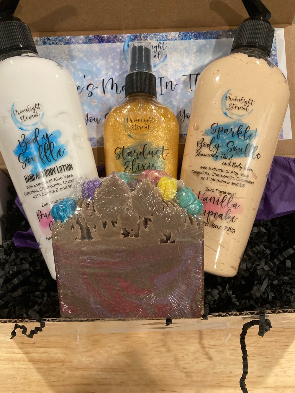 Discover your next Moonlight Eternal favorite with our mystery boxes! Each mystery box includes multiple products, with no scent repeats. Products may include our luxurious lotion bars, artisan soaps, moisturizing lotions, nourishing body oils, shimmering body sprays, and more! Each box is designed to bring a touch of magic to your skincare routine and is filled with a mix of fragrances to keep you feeling your most enchanted. Perfect for gifting to yourself or someone special, this mystery box offers the thrill of discovery with products that indulge, moisturize, and inspire.